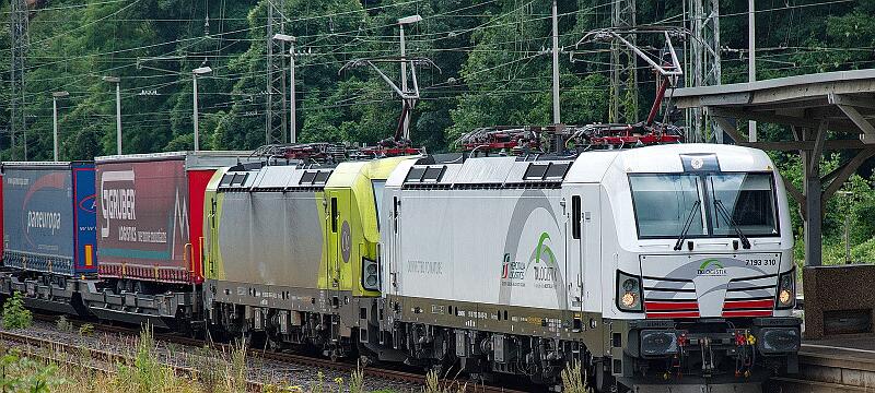 7193 310 (vorne) und 193 406 warten in Brohl auf Weiterfahrt. Wegen eines defekten Stellwerks in Brühl wird das noch dauern.