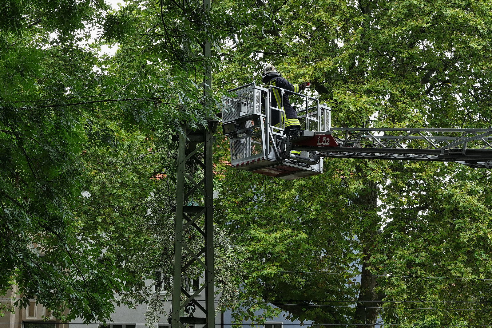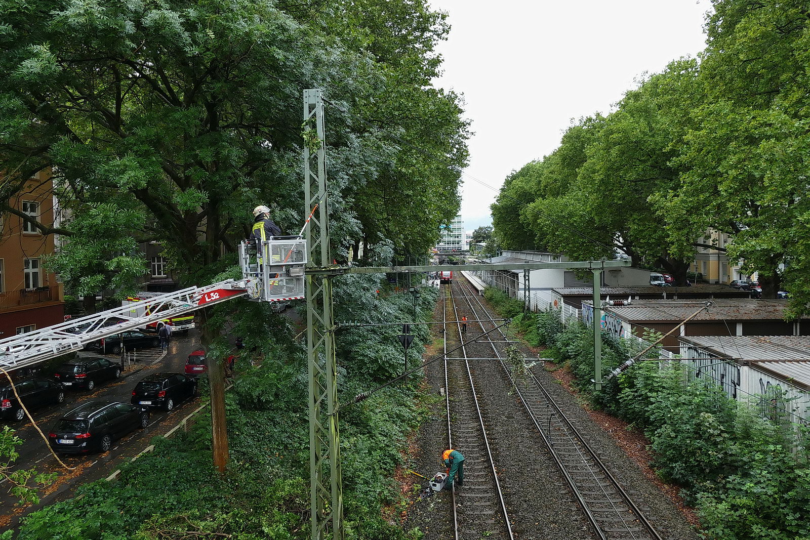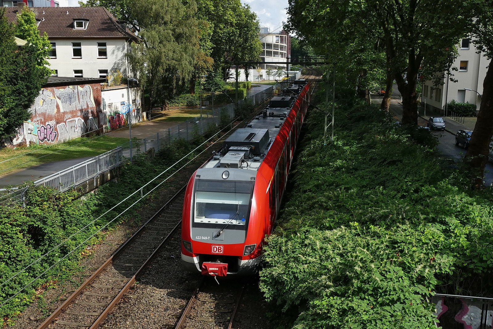 422 049 muss wegen eines Astes in der Oberleitung an der Möllerbrücke warten.