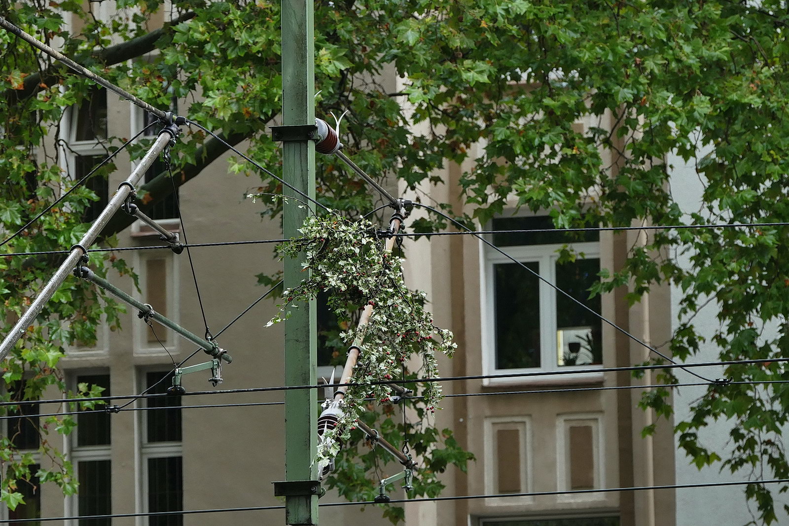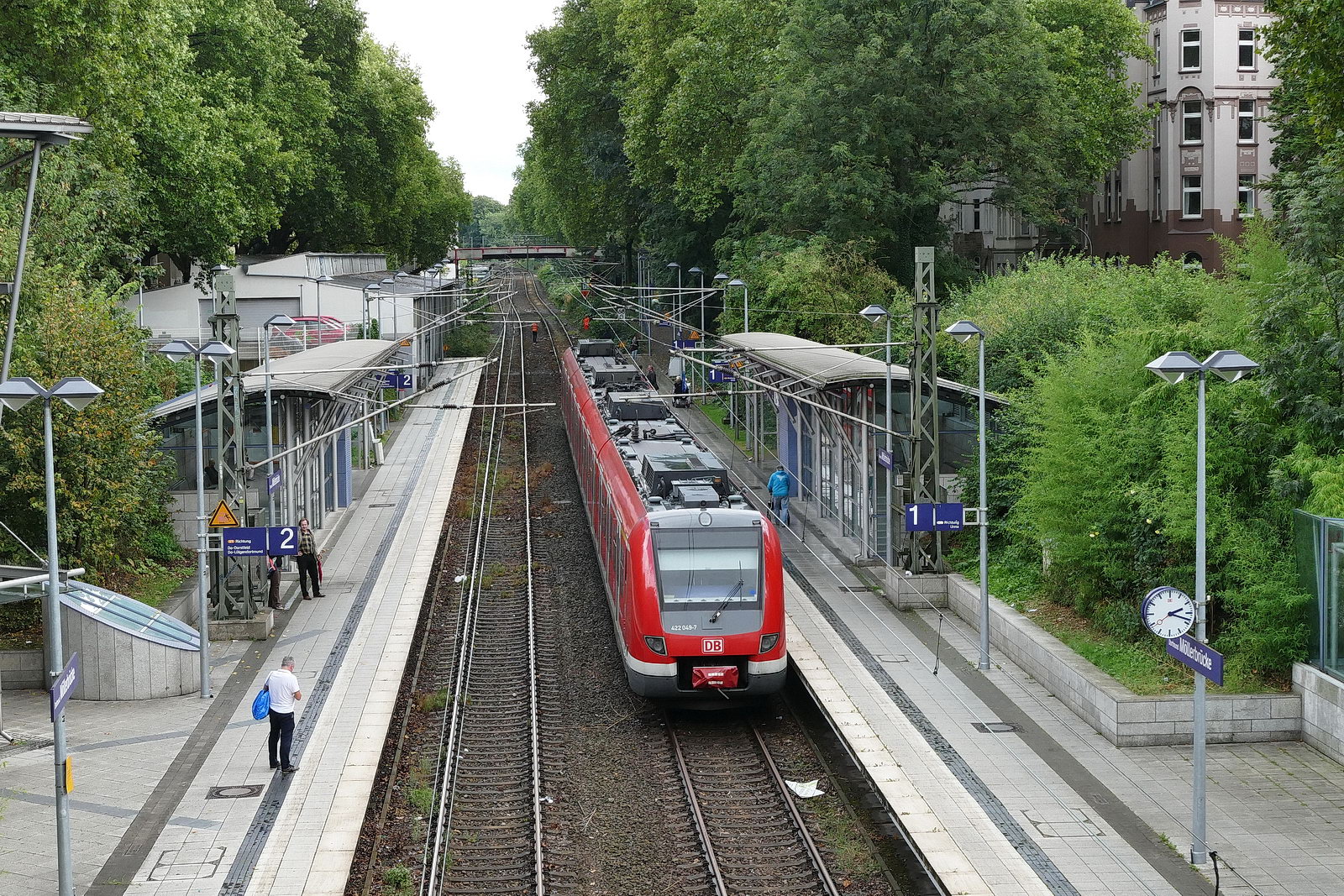 422 049 muss wegen eines Astes in der Oberleitung an der Möllerbrücke warten.